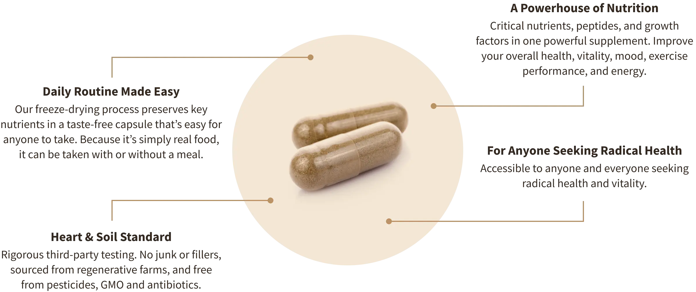 Heart & Soil Standard Rigorous third-party testing. No junk or fillers, sourced from regenerative farms, and free from pesticides, GMO and antibiotics.