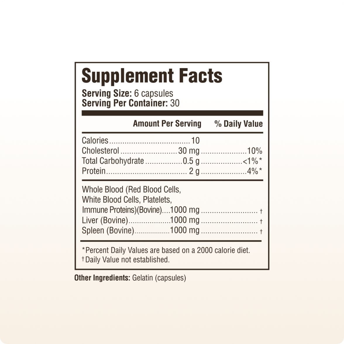 - Grass-fed & finished whole blood extract, spleen, and liver
