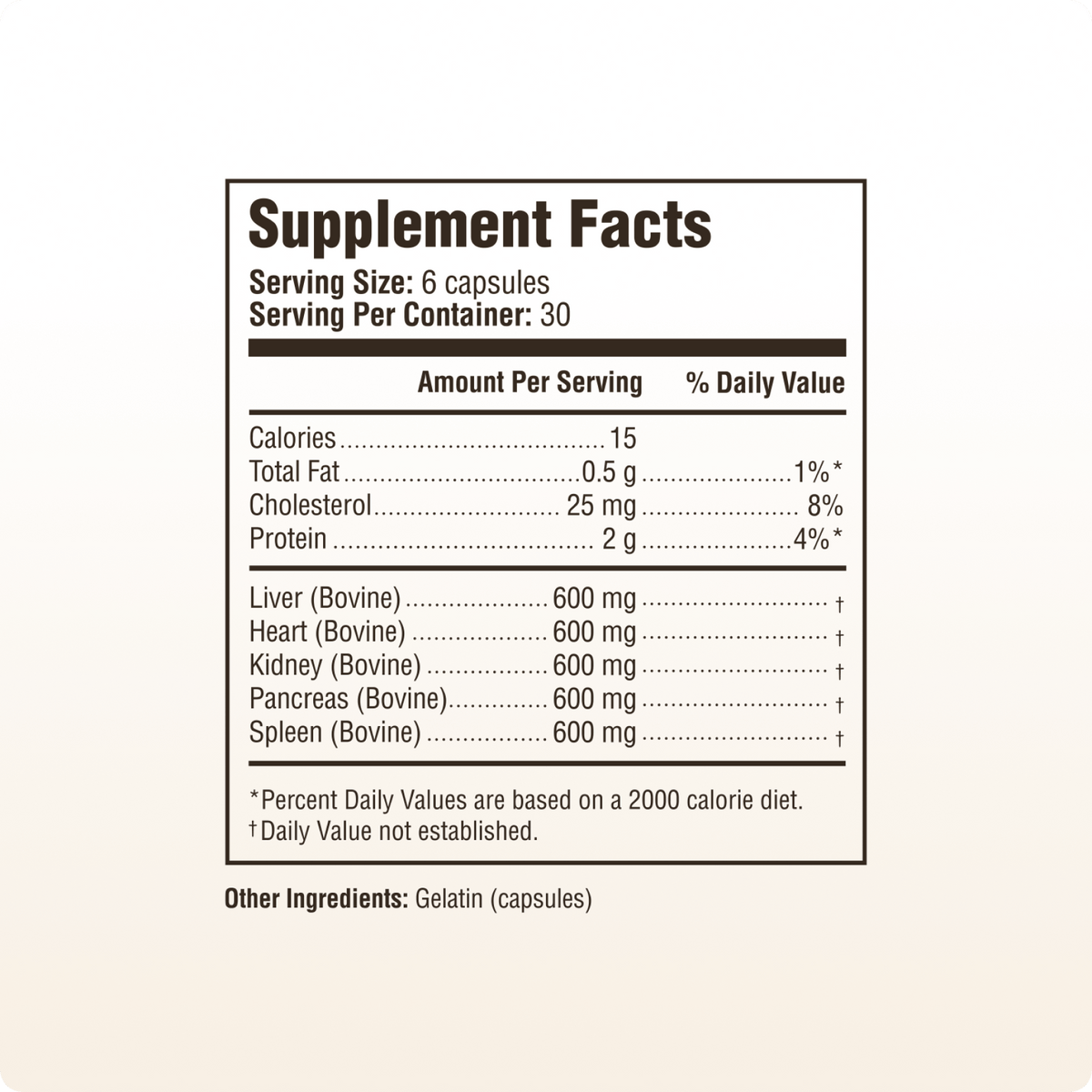 Take 6 capsules, once daily. If new to organs, we suggest starting with 1 capsule daily, and increasing your daily serving by one capsule after each week until full daily serving size is reached or use as directed by a healthcare professional.