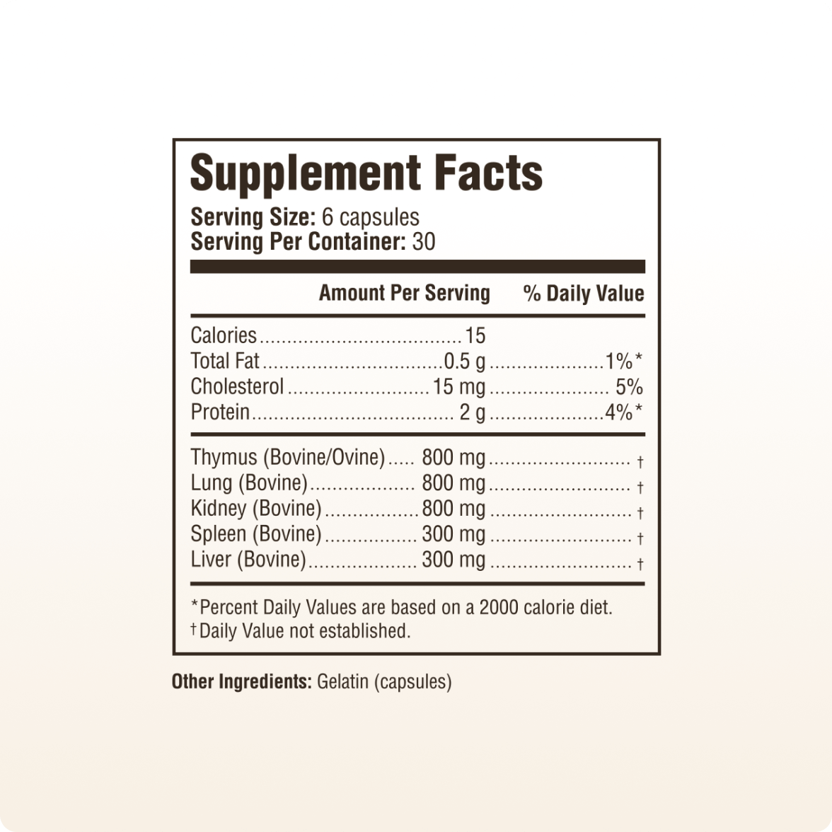- Made with grass-fed thymus, lung, spleen, liver, and kidney.