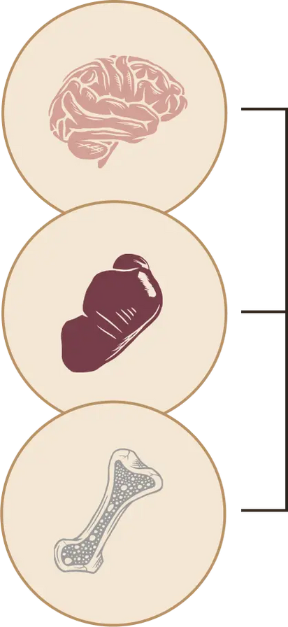 Bone marrow is vital for immune function and wound healing. The fat tissue in bone marrow contains adiponectin, a hormone that supports insulin sensitivity, reduces the risk of conditions such as diabetes and obesity-related cancers, and promotes metabolic and cardiovascular health. Additionally, bone marrow provides the compound glucosamine, which plays an important role in supporting cartilage, joints, and skin. Last but not least, it is a rich source of fatty acids to aid in boosting energy and mood as well as building bones.